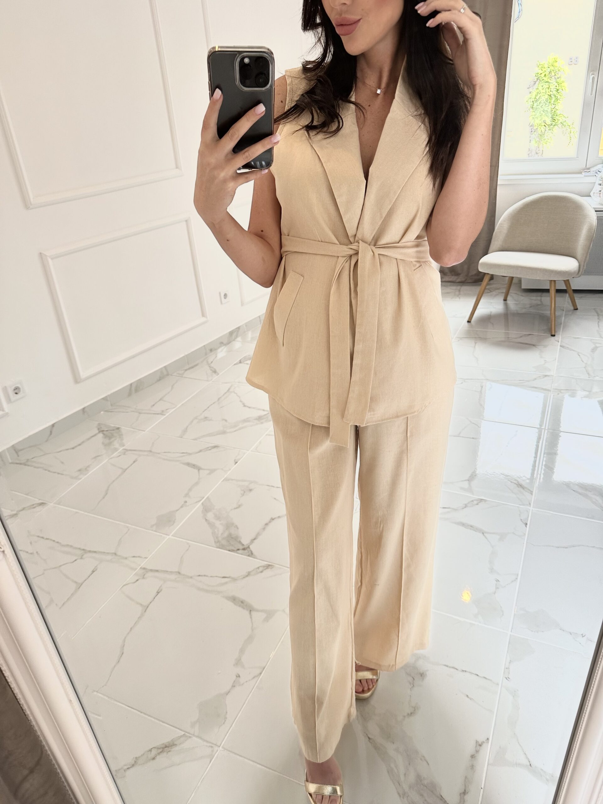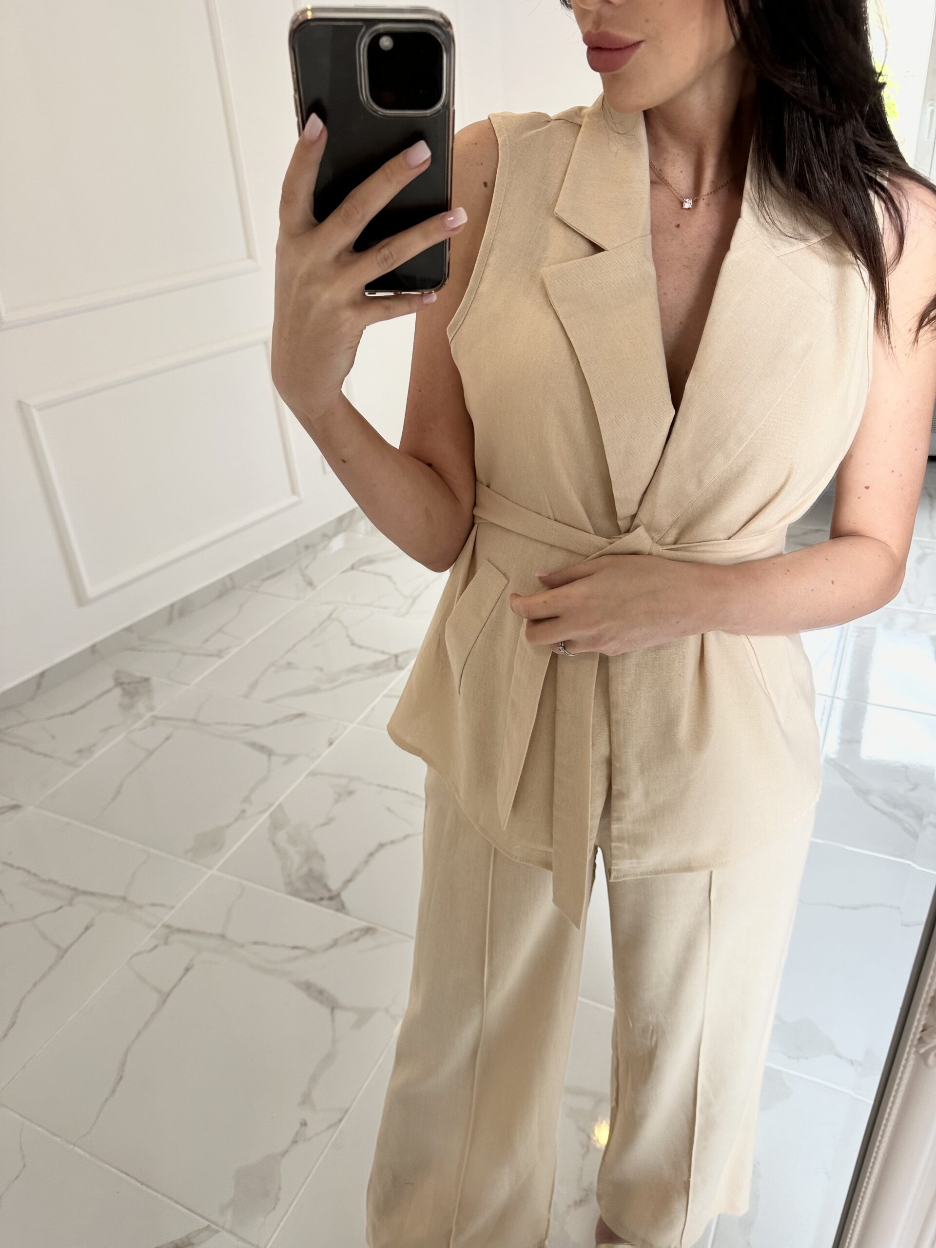 Kényelmes és stílusos női nyári szettünk len anyagból készült, ami tökéletes választás a meleg napokra. A könnyed, ujjatlan mellény és nadrág elegáns megjelenést kölcsönöz viselőjének. A szett praktikus kötővel is ellátott, amely lehetőséget ad a kényelmes és egyedi illesztésre. Ideális választás a nyári eseményekhez és sétákhoz!